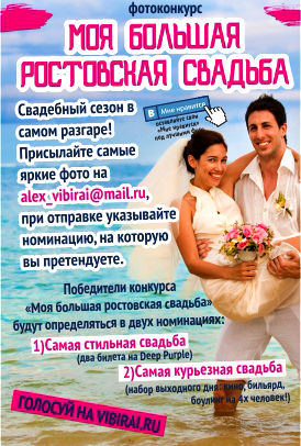 «Большая ростовская свадьба» - это не только громко, весело, но еще и стильно. Новый фотоконкурс от журнала «Выбирай». Брачующиеся и отбрачованные, женатые и собирающиеся это сделать в ближайшее время отбираем лучшие фото и присылаем по старой свадебной традиции на alex_vibirai@mail.ru